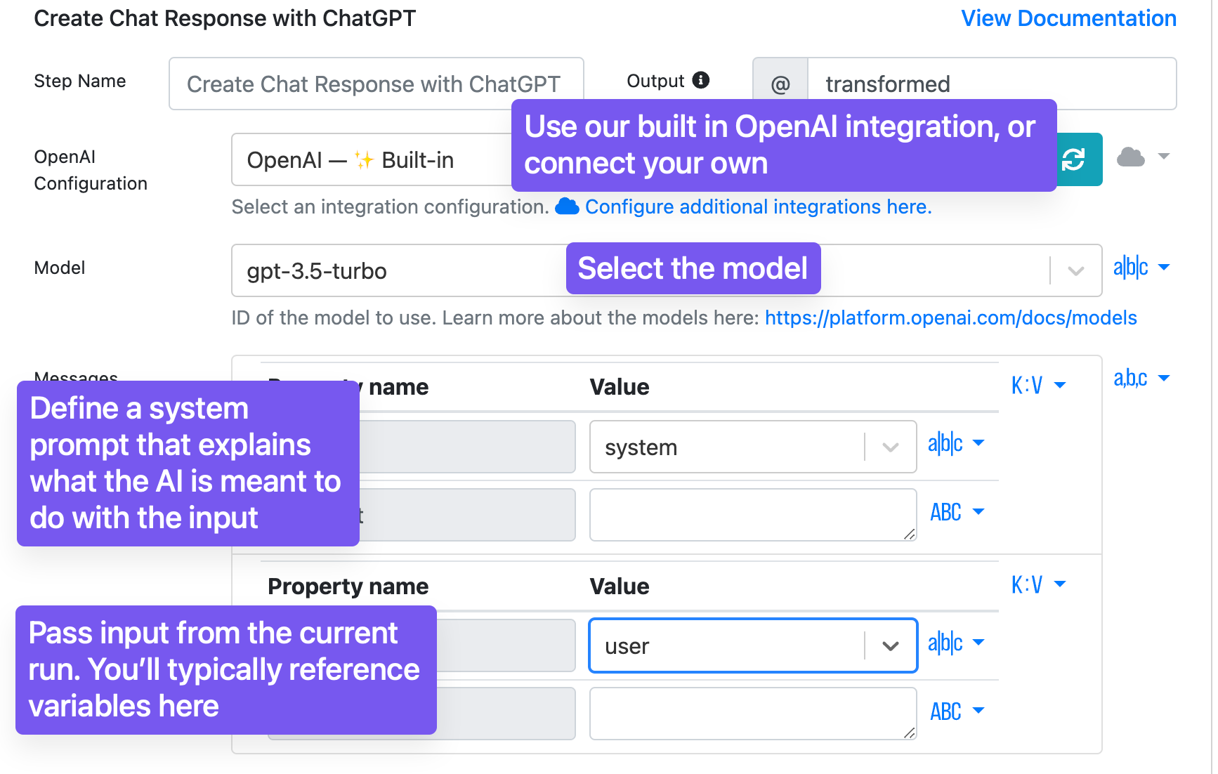 * **Messages**: define system and user prompts