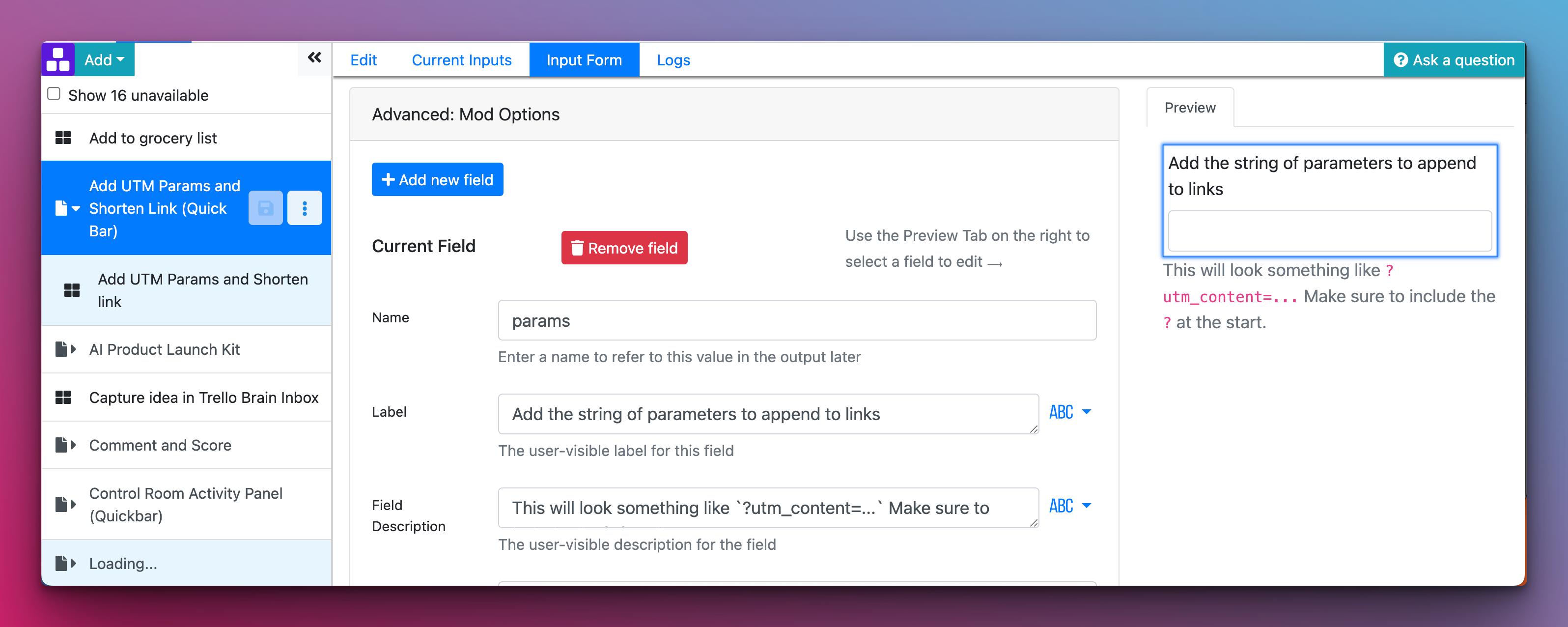 If you have non-integration onboarding options you want to add, you can add them by selecting the mod in the Page Editor and selecting the **Input Form** tab.