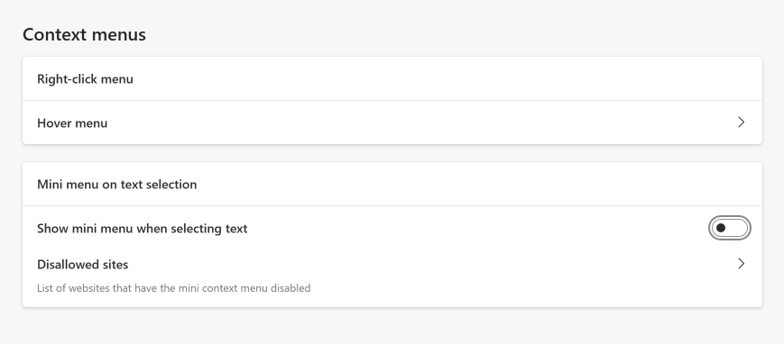 2. Under the "Context menus" section, toggle off "Show mini menu when selecting text"
