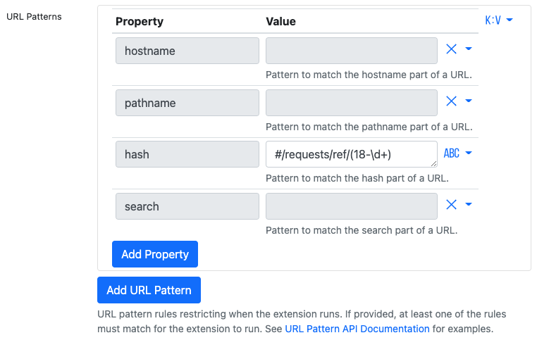 In the URL Patterns, fill the hash with the URL pattern. In AARI, the request reference follows the pattern *processId*-**runId.**