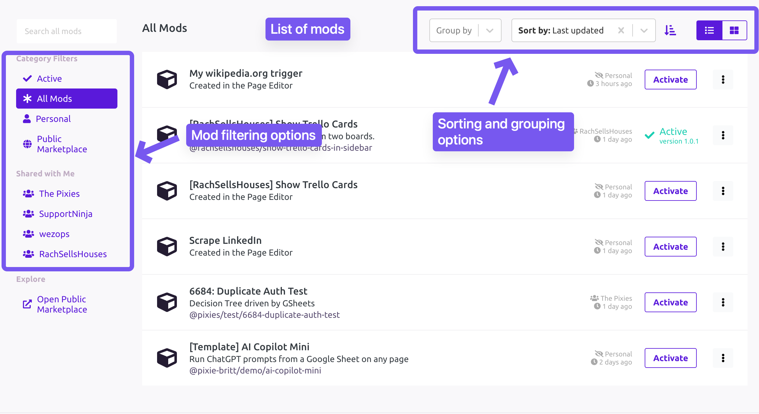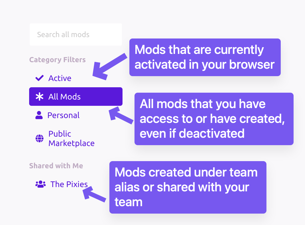 When you first arrive in the Extension Console, you'll land on the Mods Page, which shows your mods.